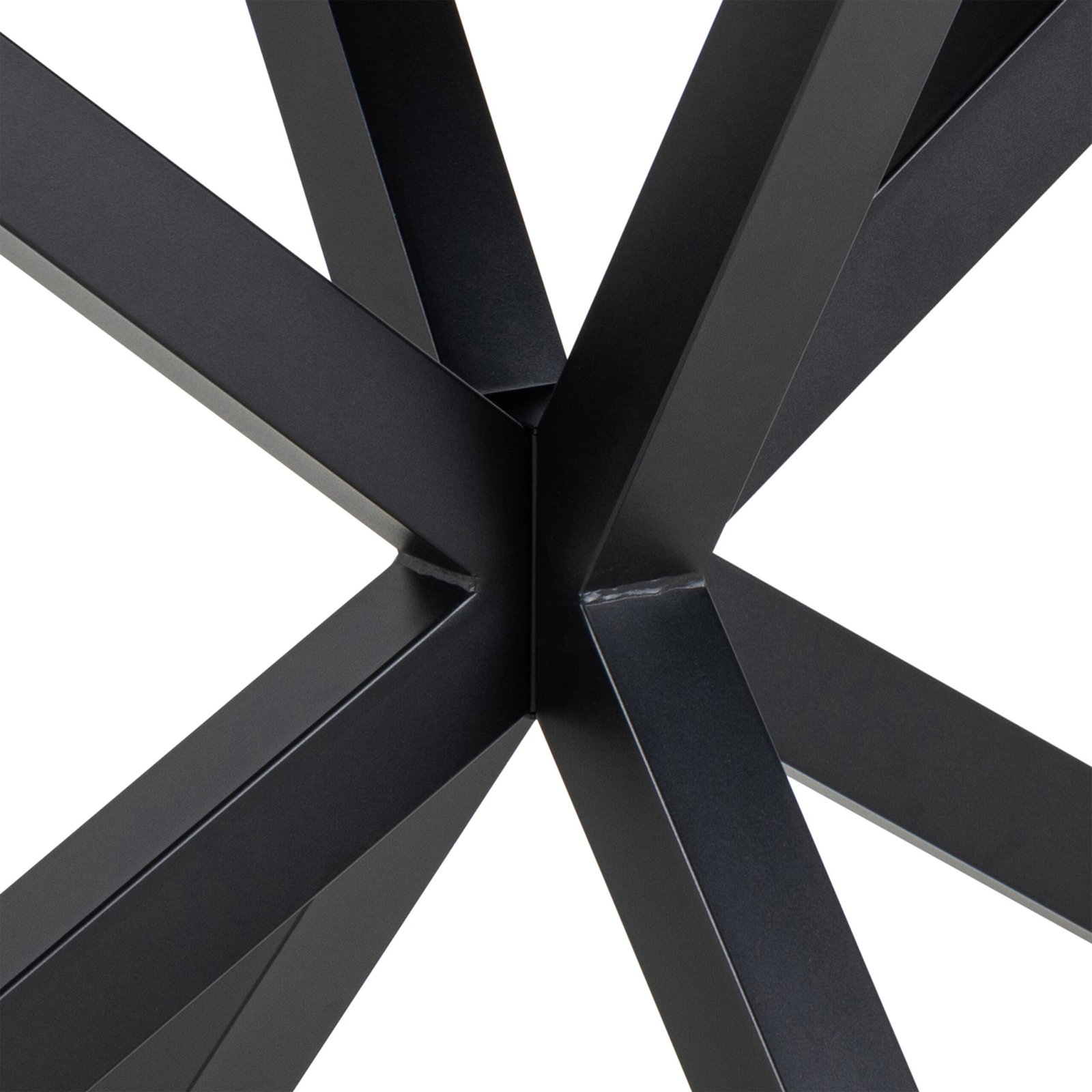 - The sculptural base, made from matt black rough powder-coated steel, adds a bold architectural mesh element to the design. Its cross-shaped structure offers excellent stability while also creating a modern, expressive silhouette that captivates from every angle. The juxtaposition of the bright ceramic top and deep black base enhances its visual appeal, making it a standout centrepiece for dining rooms of all styles.
