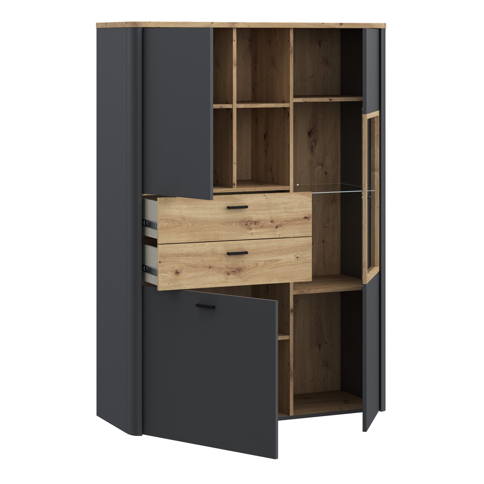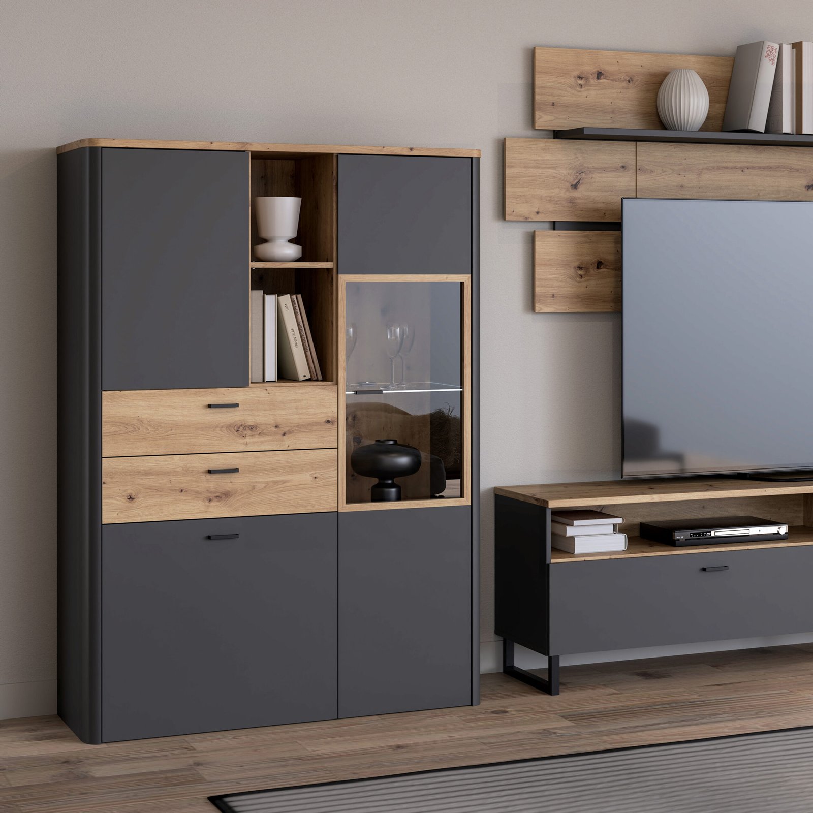 The Klara Display Cabinet with 2 Doors, 2 Drawers, and 1 Glass Door in Grey and Oak is a perfect blend of modern design and practical storage. Finished in a beautiful combination of Artisan Oak and Uni Wolfram Grey, this cabinet adds effortless sophistication to any space, whether it’s your living room, dining area, or home office. The included LED lighting takes this design to the next level, illuminating the glass display section with a soft, ambient glow that highlights your cherished items. From fine china and books to treasured keepsakes, your favourite pieces will be displayed in style.