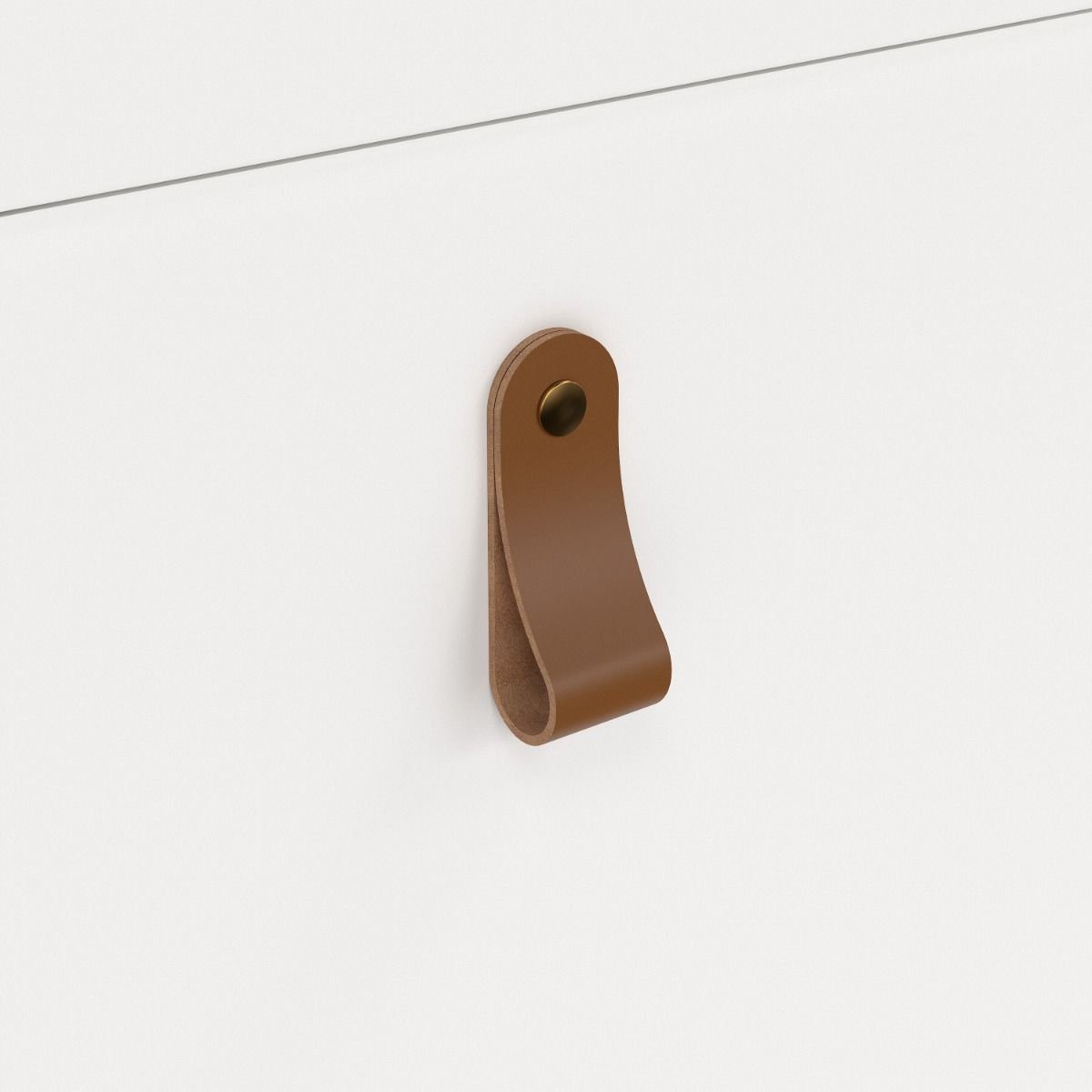 A modern shoe cabinet with four storage compartments in a striking design complete with brown leather tab handles, also available in contrasting matt black.