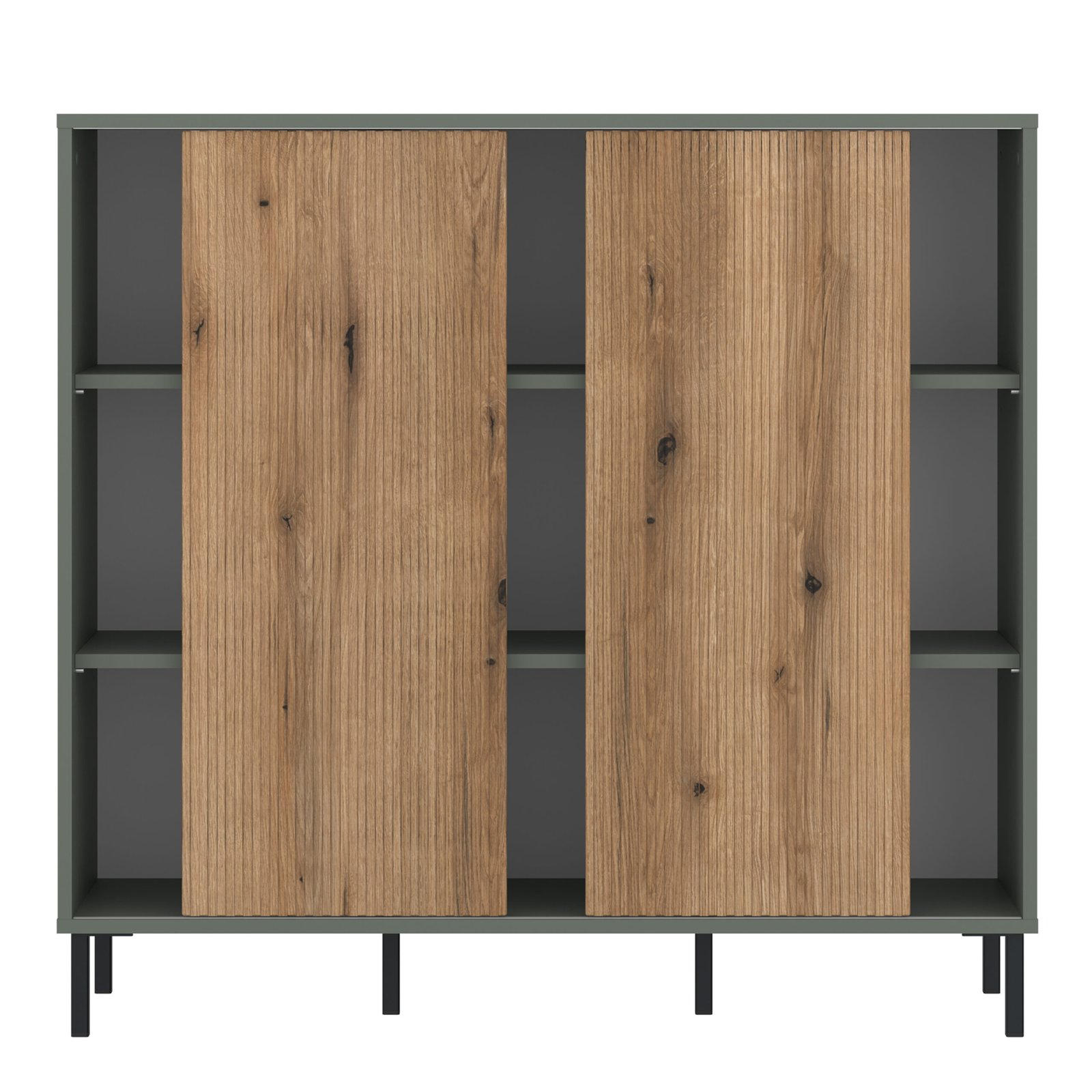 Elevate your living space with the stylish Darwin Green and Oak Sideboard. Featuring sliding grooved oak doors and a sleek grey-green finish, it’s both practical and elegant. With spacious shelves and a minimalist handleless design on high metal legs, it offers ample storage and a chic, modern look.