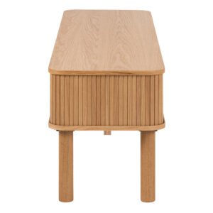 Modernize your living space with this stylish TV unit, boasting a sleek oak effect. The unique lamella design and practical sliding and tambour doors provide a sophisticated storage solution, making it an ideal addition to any contemporary home.