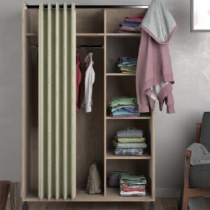 Uppsala Open Mobile Wardrobe Unit in Jackson Hickory Oak with a Beige Textile Curtain on Wheels