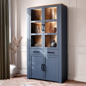 Bohol Display Cabinet 4 Door 2 Drawer in Oak/Navy inc LED Lighting