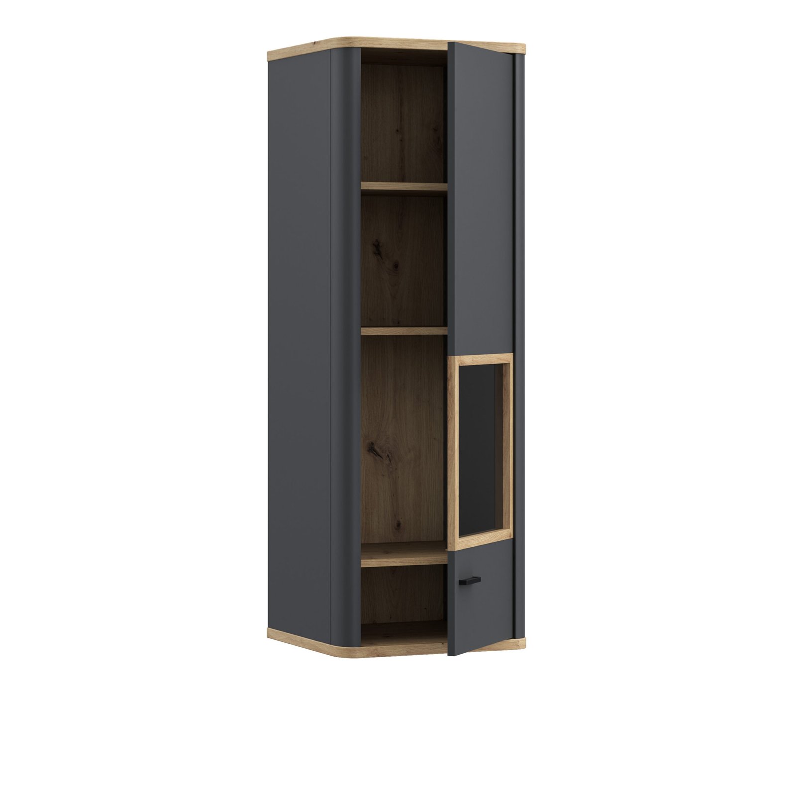 The Klara Display Cabinet with 1 Glass Door in Grey and Oak combines sleek design with practical functionality, making it a perfect choice for smaller spaces. Add a modern touch to your space with the Klara Display Cabinet, featuring a stylish combo of Artisan Oak and Uni Wolfram Grey. Its sleek design doesn’t just fit into any room-it upgrades it. The built-in LED lighting creates a cozy glow, perfect for showing off your favorite ornaments, photos, or décor pieces. Made to last, the Klara is crafted from high-quality materials, blending durability with a refined look. The silent-closing mechanism keeps things smooth and quiet-because who needs noisy cabinets? With sturdy shelves holding up to 5 kg each, you can confidently display everything from heavy books to your most delicate treasures.